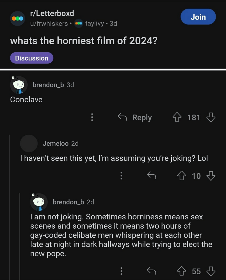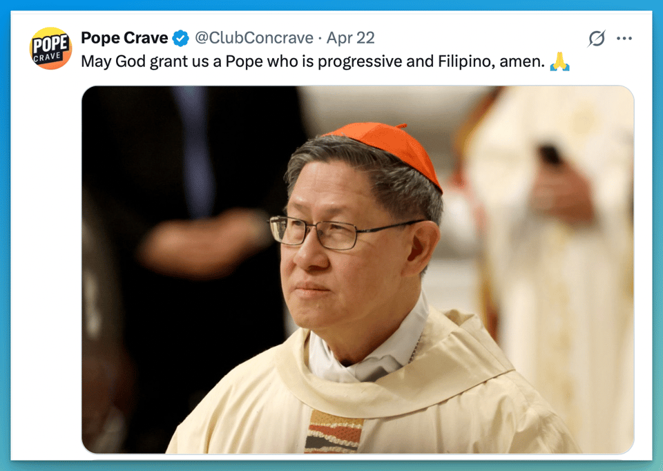 Fans have taken to Conclave like ducks to water (turtles to fountains?). The art on Tumblr is great. There are already 800 stories on AO3. The twitter account Pope Crave (@clubconcrave) has over sixteen thousand followers, and posts a constant stream of excellent Conclave memes. Speaking about the draw of the film for fandom, the owner of the account said: