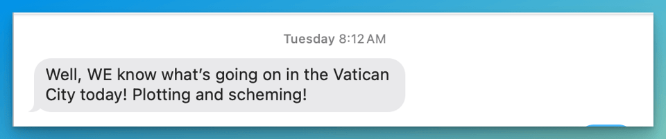 It struck me that while we’ve always had a pop culture fascination with the election of a new pope, and most of us could make some joke about the colour of smoke, last year’s hit film has made an arcane and secretive process something that feels culturally familiar. My mother even texted me: