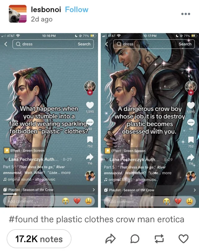 Tumblr is excellent for that. A couple of weeks ago, Tumblr collectively lost its mind over this fantasy book series about a girl in a plastic/pleather dress who gets transported to a magical world where there’s a dangerous crowboy whose job is to destroy plastic. It’s a real book series, but the premise is so out there that Tumblr did what Tumblr does best and fully committed to the bit – very Goncharov behaviour.