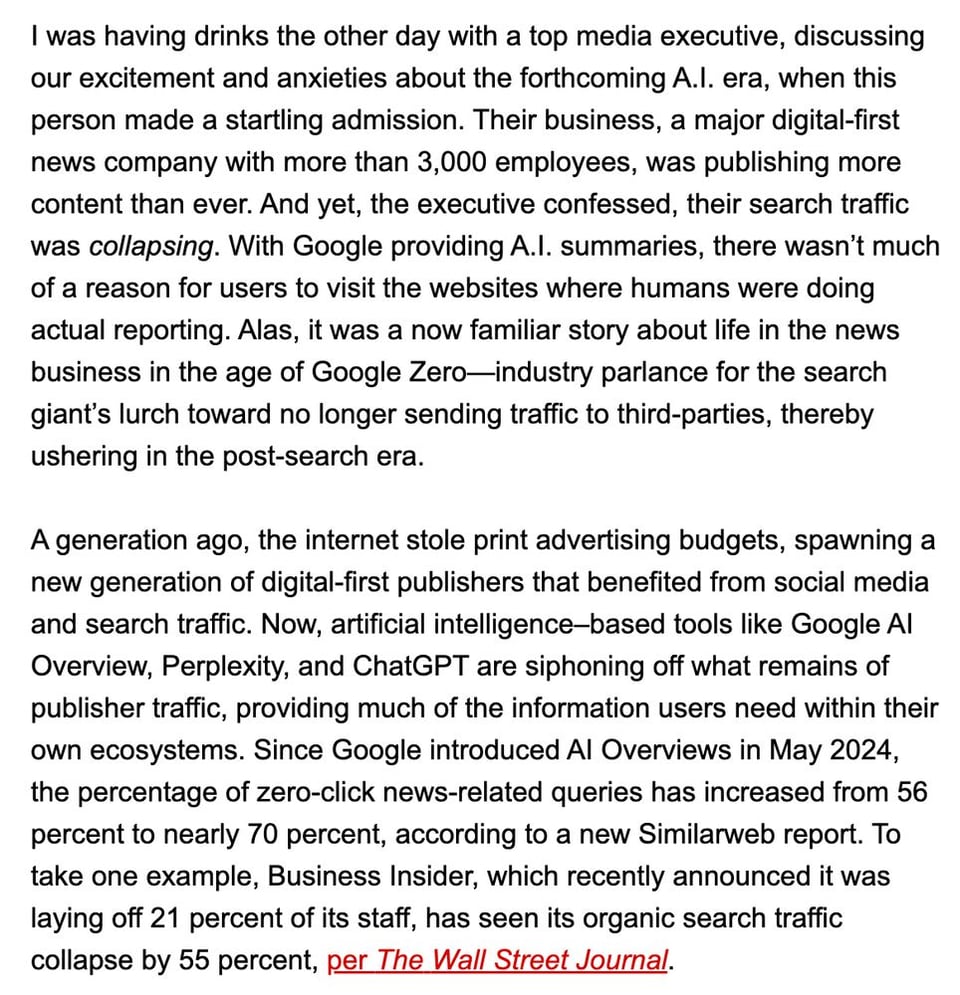 I’ve been writing a lot this year about how AI is destroying search, and I think people are only just starting to get to grips with that. Jay Rosen shared this from Julia Alexander at Puck this morning: