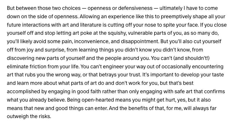 I liked this take on the mess surrounding Mia Ballard’s Shy Girl, and why it’s still so important for us to leave room to be optimistic, let down, or surprised by things.