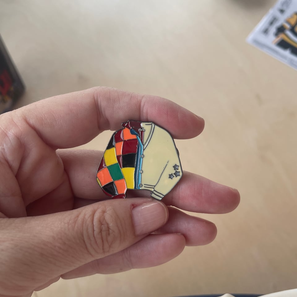 Everyone else in the family drew a blank looking at it. But if you know, you know. It’s an enamel pin of a cardigan that’s half Taylor Swift’s distinctive folklore cardigan, and half the JWA cardigan made famous by Harry Styles.