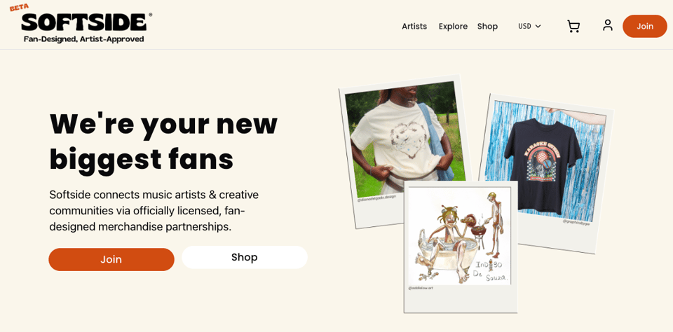 Founded by former touring professional Erin Singleton, Softside enables fans to collaborate directly with artists on officially licensed merchandise — with royalties flowing back to the fan-designers rather than a flat buyout. Not every fan wants to participate in a design contest, starting from scratch and then maybe not getting picked. Some fans have already made beautiful work. The idea that this creative output could feed back into an official process — with proper compensation — would be a meaningful structural change. Singleton observes that the standard industry practice has historically been to pay a fan a flat fee for a design, put it on the road, sell thousands of units, and pay them nothing further. The royalty model she's describing isn't radical in any other creative industry.