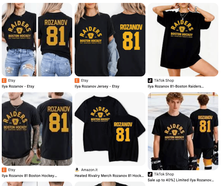 Order any of these “high quality” “limited edition” tees and I guarantee you’ll get a a temu synthetic that makes your skin itch before you even get it out of it’s plastic wrapper. And no, you might remember etsy as a site for handmade work by real people, but not anymore. It’s flooded with dropshippers, bots and scams. When you search for merchandise around almost any popular artist or tv show this is what you get: a sea of print-on-demand junk, algorithmically optimised for discoverability and priced to make you feel like you're getting a deal, which you’re not.