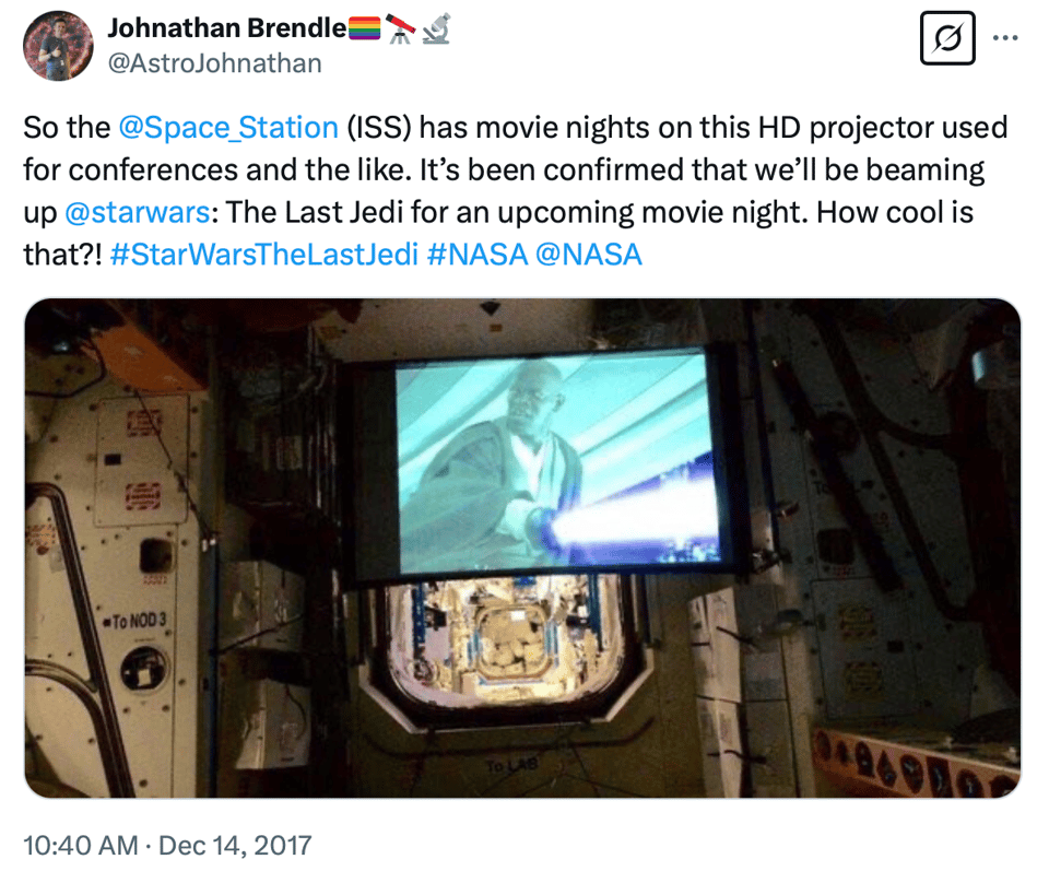 they have movie nights on the ISS and got Star Wars:The Last Jedi sent up on its release in 2017.