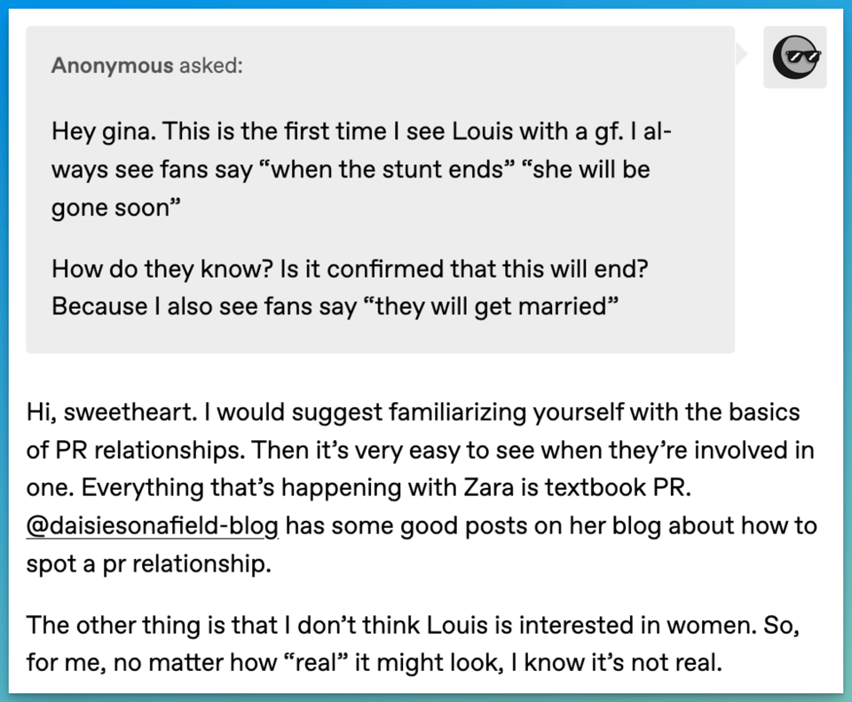 loved this piece from Kat Tenbarge about the Gaylor crashouts. But I land in a less optimistic place than she does. I'm still watching Larries crash out every time Louis is pictured with his girlfriend Zara, and they're not just sad about a "fantasy" bubble being burst, they're angry and still convinced they know a different truth.