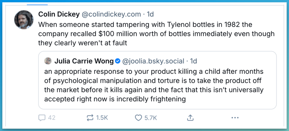 As I said two weeks ago, I get called an AI hater by friends and nemeses alike at the moment, but when your product stops talking to kids about cats and starts talking about nooses, we all have a role to play in smashing the looms.