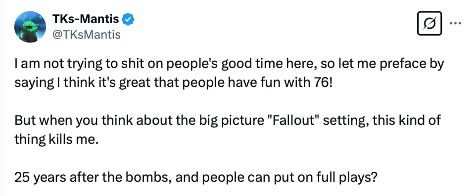 I’ve never played the game, but the TV adaptation is great. (Aside: because I’d never played the game, I was surprised by the whole people-living-in-a-silo-after-an-apocalypse vibe turning up again, and had to immediately go digging to find out which preceded what. Howey says Fallout inspired the books). Anyway the game has different versions, and in the first multiplayer online version — Fallout 76 — players started doing what people always do in MMORPGs: pretty much anything.