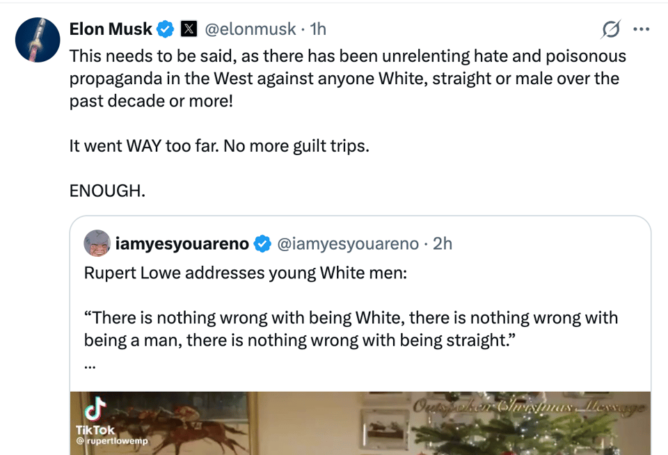 Whatever Elon wants to say is constantly promoted into everyone’s feeds, whether you want it or not. And in case you think that means you’re subjected to tesla ads — no, just a steady diet of white supremacy: