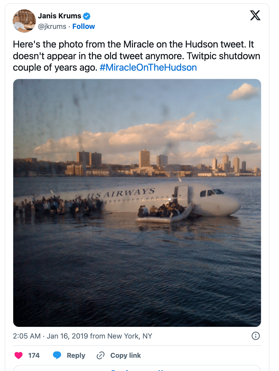 But for a time, twitter was one of my favourite places online. I joined in March 2007, just a year after the platform was founded. For whatever reason there was a vibrant group of people from Aotearoa using it in those early years. I remember giving a presentation to my fellow partners at my law firm about why we should set up a branded twitter account in 2009. I remember showing them the photo of the Miracle on the Hudson tweet and trying to explain why this was how information would move now.