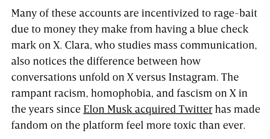 This got me to thinking, because it seems obvious to me that the racism and homophobia that is now baked into X would cause and amplify the same in a stan setting. The Wired article spends just one paragraph considering that possibility: