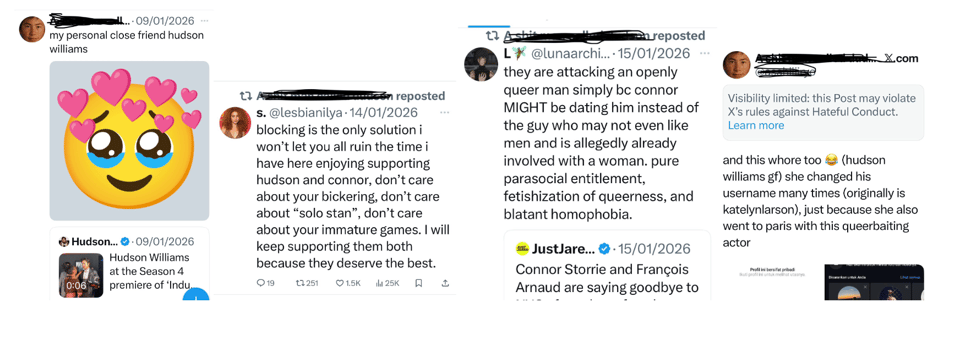 I’ve spent time over the last few weeks in the Heated Rivalry fandom on tiktok, insta, bluesky and tumblr. The only negativity in those spaces has been when people have been discussing the drama on X. Otherwise it’s been cute and upbeat and joy-filled. By contrast, here are four posts over the course of two weeks from one user on X: