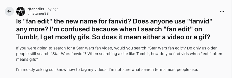 Last year when we were talking about context collapse and the fourth wall, I spent a bit of time explaining fanvids. Then later we talked about fan edits, where fans recut movies or shows themselves to reflect a different story they wanted to tell. This week I want to talk about their gen z offspring, confusingly also called fan edits.