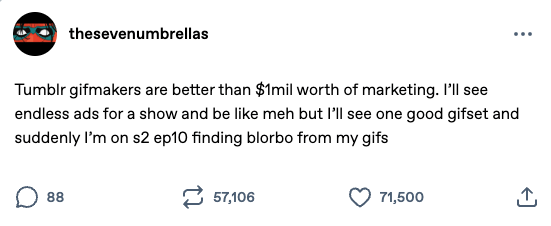 Obviously these are limited examples, but I think they point to something interesting. As transformative work comes out of fan spaces and floods mainstream platforms like tiktok and insta, it becomes impossible for studios and labels and rightsholders to overlook the impact that it’s having. How much more compelling the content created by audiences is than that put out through official channels, and how that directly translates into word-of-mouth buzz better than any paid advertising.