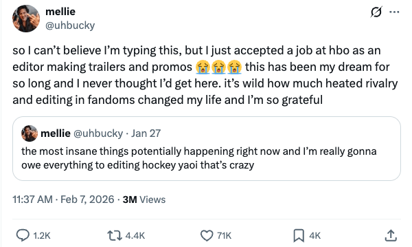 So keep an eye out for the next time you see a 38-second edit that makes you want to rewatch an entire series, or fall in love with a fictional hockey player, or care about a character you’ve never met. The work behind it isn’t frivolous. It’s taste-making. And increasingly, it’s a career path.