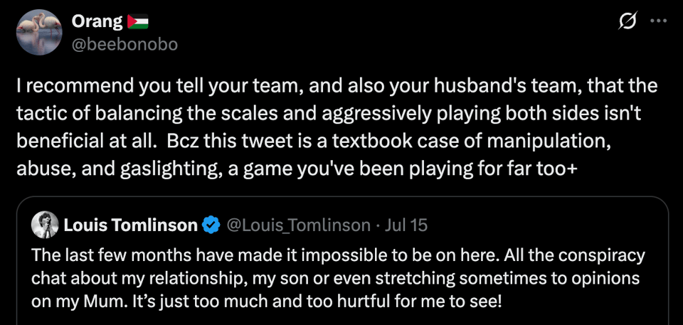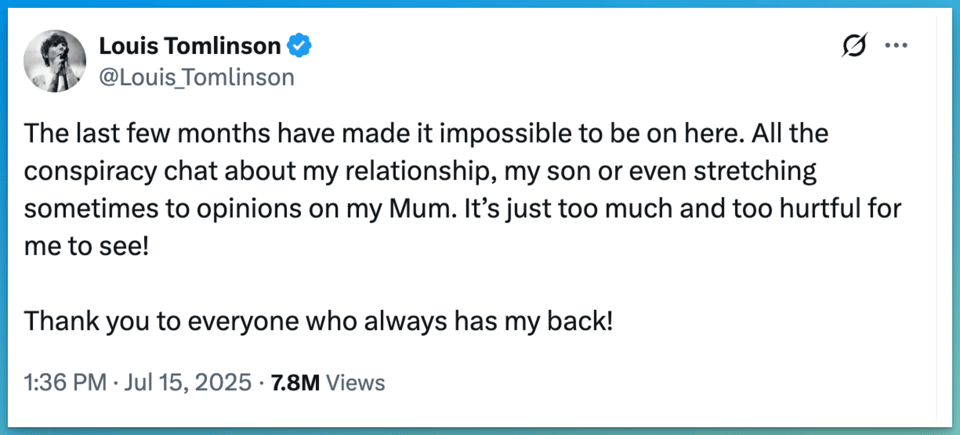 One of the things I love about being micro-famous for talking about One Direction conspiracies is that so many people sent me links to the stories about Louis Tomlinson’s tweet this week. For those of you blissfully unaware, Louis is a former 1D member who has been plagued for a decade now by conspiracists who think he’s secretly married to Harry Styles. This is despite outright denials from the pair, Tomlinson repeatedly (and currently) dating women and fathering a child with one. In the past, he has said: