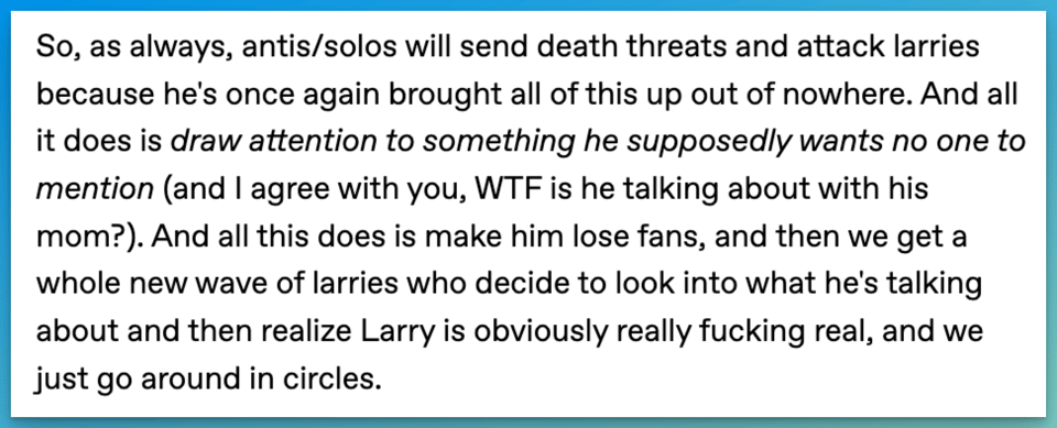 You’d think that fans of a celebrity who is this clear that their behaviour is unacceptable and hurtful would immediately cease and desist, but Larries have been at this for too long, and nothing will deter them now.