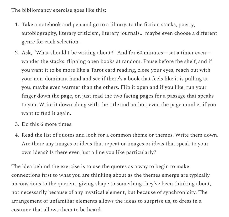 this “bibliomancy” exercise from Alexander Chee (screenshotted for those who feel about substack the way that I do)