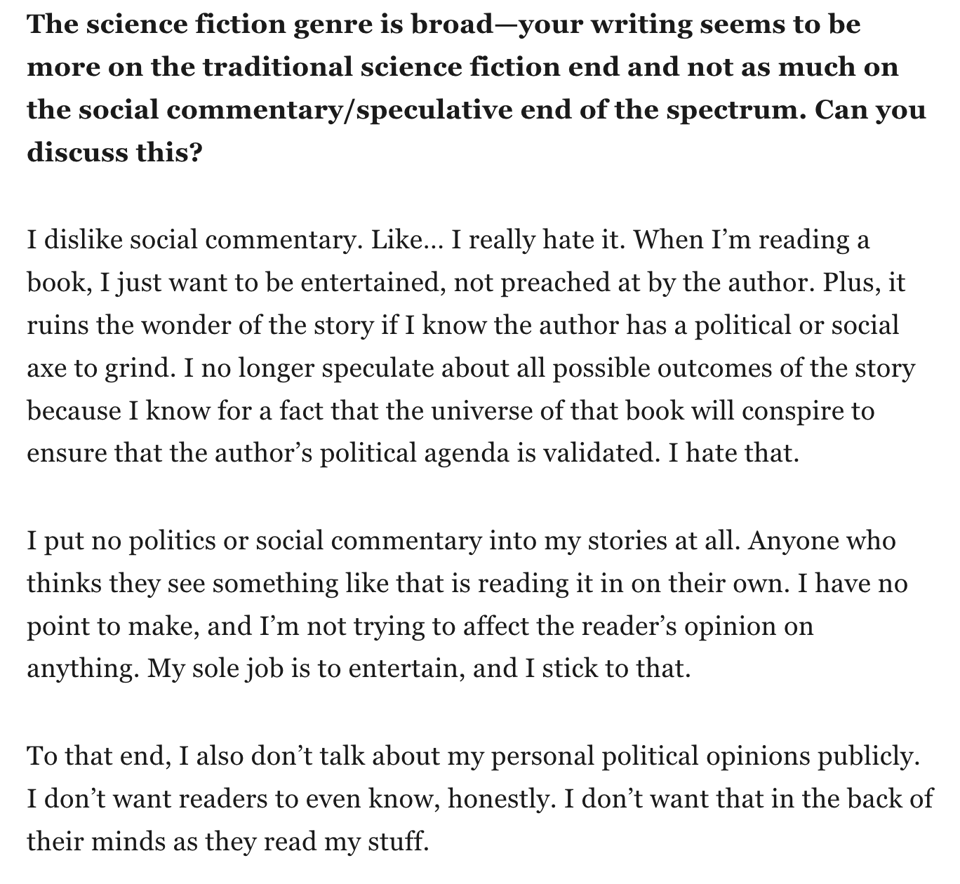 Anyway, back to Andy Weir. So he hates the new Star Treks and says so on a right-wing-coded pod. People who love him for The Martian are disappointed. And then an old interview from 2018 comes to light in which Weir had this to say: