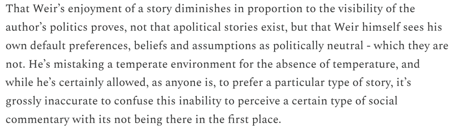 I still believe this idea of "neutrality” is so dangerous. People like Weir want to maintain that he’s somehow above the fray, not injecting politics into his work and not wanting anyone to be distracted by his beliefs. But then he chooses to go on a defiantly non-neutral platform to shit on a more liberal piece of media. The core of it though is that Weir seems to think his views are neutral. I loved this essay (on Substack, sorry, the irony) from Foz Meadows: