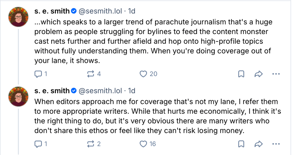 And to go further, as s.e. smith says, the right thing to do is often to get someone else to write the piece, but that’s not the economic reality for a lot of people.