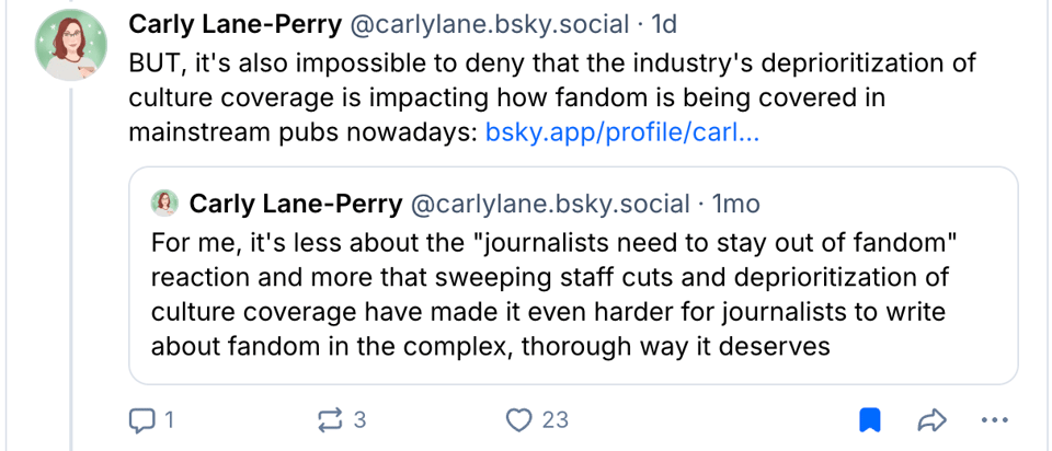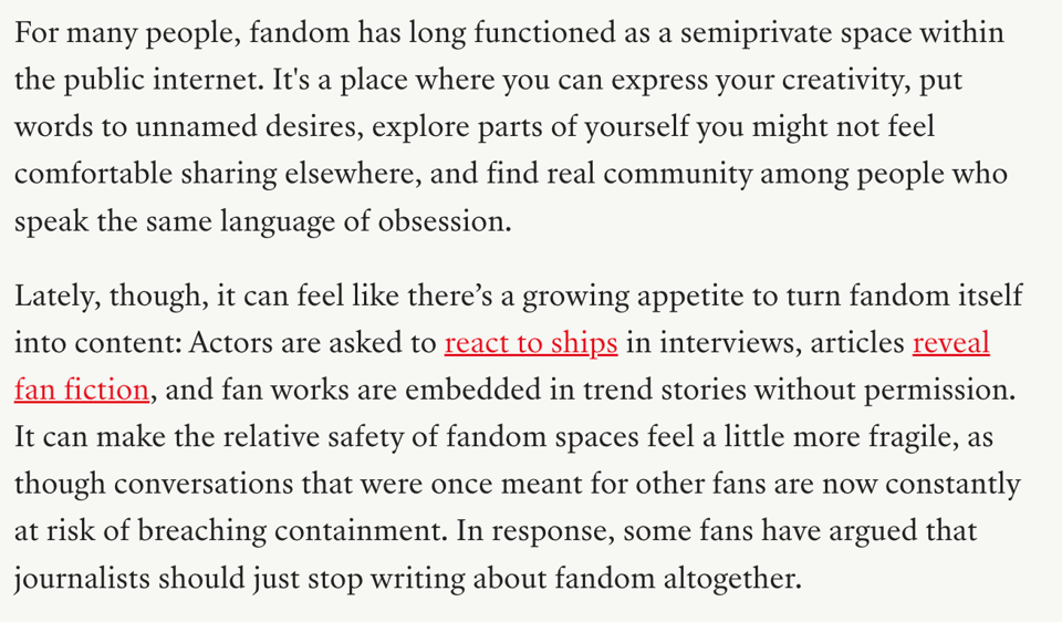 As Bell notes, there’s a few things going on here. Fandom is an increasingly powerful cultural force, so journalists are obviously going to want to write about. The “safe” spaces in which fandom used to operate are increasingly being flattened by platforms, meaning more and more fandom is happening on main. And as we’ve talked about recently, studios and labels are increasingly looking to fandom for marketing and even paid opportunities. It’s naive to think that fans should just be left alone in our little corners of a very public internet, or that noone should examine us when we wield real cultural and economic power.