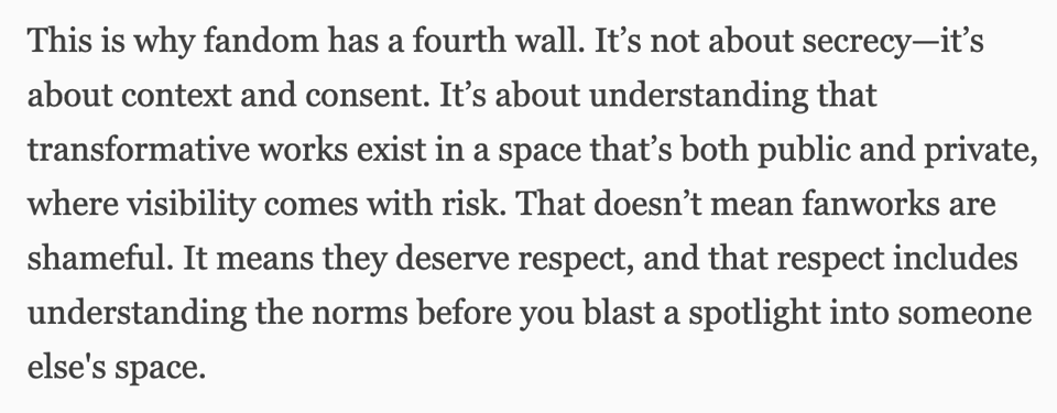 It might be too much to hope that every time an article is commissioned, someone knowledgeable gets to write it, but at a minimum I think we should be able to expect consent from everyone whose fanworks are featured. “Fan fiction, especially, has long functioned as a place to test ideas about gender, sexuality, romance, and power in a relatively low-stakes creative environment,” writes Bell, and that means you can’t just throw these creators under the bus by putting their work on blast in mainstream publications.