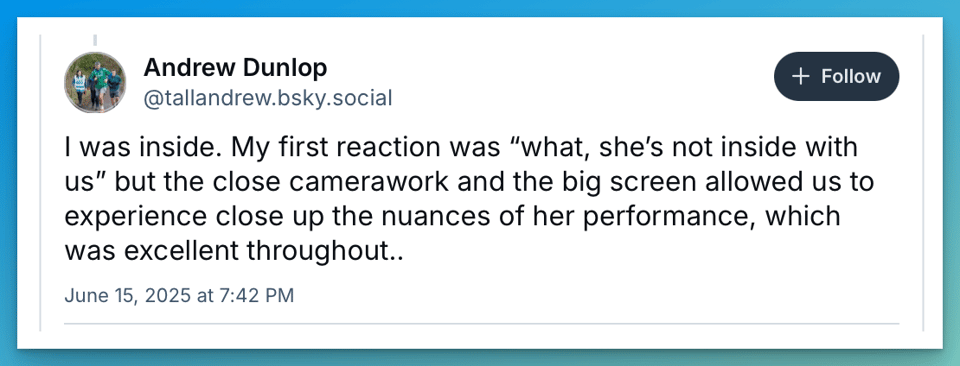 And that’s what I love about Rachel Zegler taking to the balcony outside. It’s not (as some people have tried to gin up backlash) a slap in the face to the theatre-goers who have paid over the odds to be inside.
