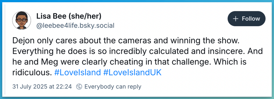 Reality TV isn't just entertainment, it shapes how people think about relationships, gender roles and what kind of behaviour is acceptable. When toxic behaviour goes unchecked on-screen, it sends a message that things like lying, gaslighting, emotional manipulation, and disrespect are just part of dating, or worse, that women should expect and accept this kind of treatment. When women's boundaries are ignored, when their emotions are mocked, and when bad behaviour is brushed off as "banter" or "just how boys are," it contributes to a culture where misogyny is normalised. This isn't just about one show, it reflects wider problems in society. What we tolerate on screen influences what we tolerate in real life.